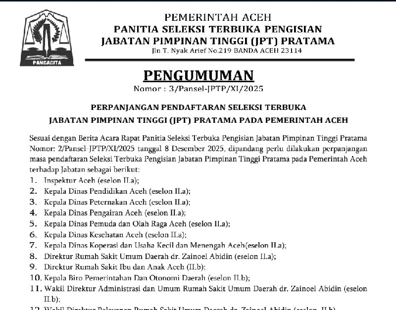 DIALEKSIS.COM | Banda Aceh – Pemerintah Aceh resmi memperpanjang masa pendaftaran Seleksi Terbuka Jabatan Pimpinan Tinggi Pratama hingga 16 Desember 2025. Kepastian ini tertuang dalam pengumuman yang ditandatangani Ketua Panitia Seleksi, M. Nasir, setelah rapat panitia memutuskan perlunya memberi waktu tambahan bagi para pelamar.
