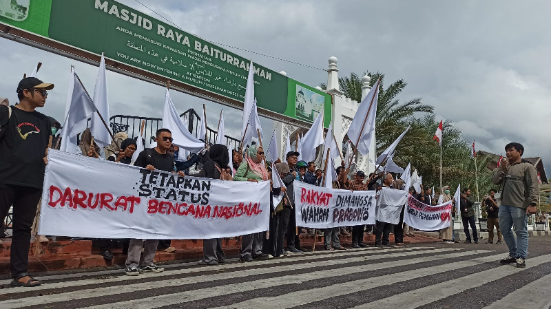 Tuntutan itu disuarakan dalam aksi Koalisi Masyarakat Sipil Aceh Peduli Bencana Sumatra di depan Masjid Raya Baiturrahman, Banda Aceh, Rabu, 18 Desember 2025. Aksi tersebut diwarnai pengibaran bendera putih sebagai simbol kekecewaan terhadap penanganan bencana ekologis yang dinilai lamban dan tidak serius.