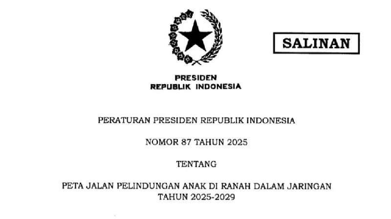 Salinan Perpres Nomor 87 Tahun 2025 tentang Peta Jalan Pelindungan Anak di Ranah Dalam Jaringan Tahun 2025-2029. (Foto: Dok JDIH Kemensetneg]