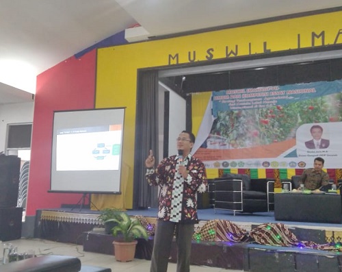 Dr. Rahmat Fadhil S.TP M.Sc, pakar pengembangan kawasan menjadi pembicara utama pada Seminar Nasional yang dilaksanakan oleh HIMAGEO Unsyiah, Selasa (29/10/2019). [Foto: Ist.]