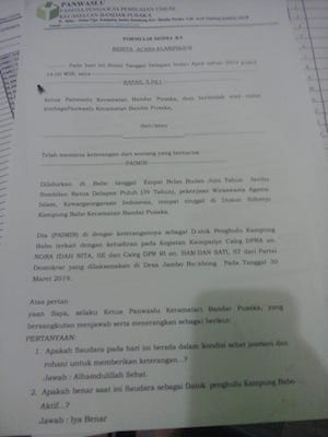 "Dari Delapan Datok Penghulu dan mukim yang diundang untuk dimintai keterangan hanya Datok Penghulu Kampung Babo yang memenuhi undangan klarifikasi di kantor Panwaslih Kecamatan Bandar Pusaka dan menandatangani berita acara klarifikasi," jelas Ferry.