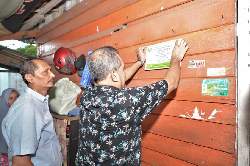 DIALEKSIS.COM | Sabang - Sekretaris Daerah Kota Sabang, Drs. Zakaria MM melakukan penempelan stiker secara simbolis kepada Rumah Keluarga Penerima Manfaat (PKM) dari Program Keluarga Harapan (PKH) yang dilakukan oleh Dinas Sosial, PMG, PP Kota Sabang, Sabtu (28/12/2019).