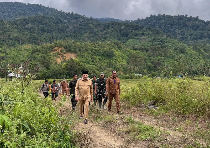 DIALEKSIS.COM | Suka Makmue - Bupati Nagan Raya, Provinsi Aceh, Dr. TR. Keumangan, S.H., M.H., yang akrab disapa TRK, menelusuri jalan setapak sejauh hampir empat hingga lima kilometer dengan berjalan kaki untuk mencapai kawasan permukiman warga yang luluh lantak akibat banjir bandang di Kecamatan Beutong Ateuh Banggalang, Selasa (9/12/2025).